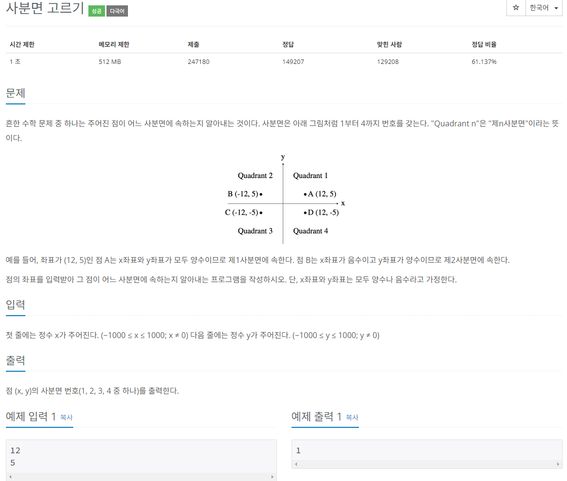 처음에 이 문제를 봤을 때 x와 y가 0인 경우에는 어떻게 처리할지 궁금했는데 입력 조건을 보면 0이 될 수 없다는 점을 밝혔기 때문에 x와 y가 0인 되는 경우는 생각하지 않아도 됩니다.