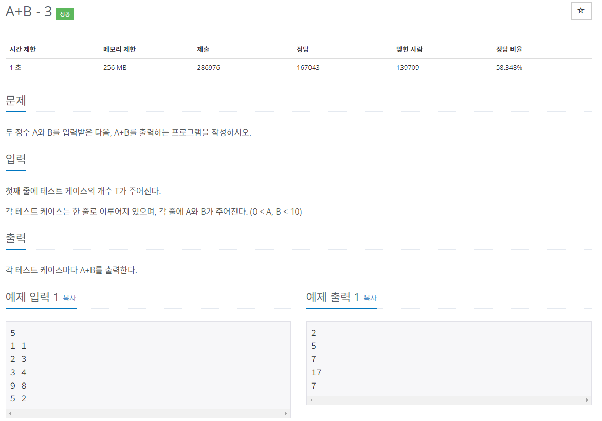 테스트 케이스를 처리하는 방법과 두 정수를 입력받고 값을 더하는 방법으로 나누어 생각한 후 코드를 작성합니다.