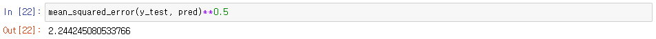 루트 평균 제곱오차로 MSE에 루트를 씌워 계산합니다. 0에 가까울수록 좋은 지표이지만 절대적인 지표가 아닌 상대적인 지표입니다.