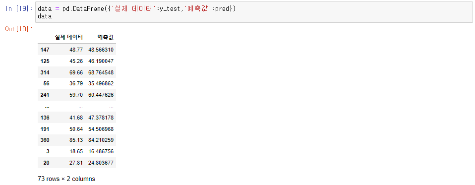 값이 작고 데이터 자체가 선형 회귀 분석에 적합한 모델이었으므로 RMSE는 여기까지 계산하고 R2 값을 확인해 줍니다.