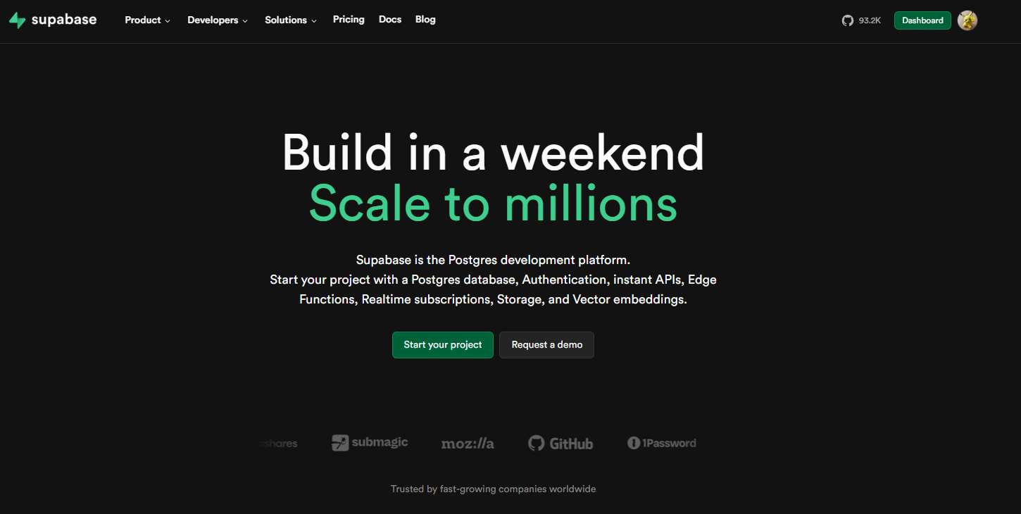 Build production-grade applications with a Postgres database, Authentication, instant APIs, Realtime, Functions, Storage and Vector embeddings. Start for free.