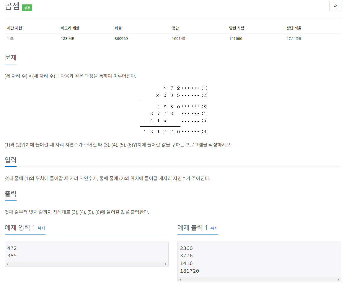 문제를 보면 바로 떠올릴 수 있는 방법은 두 번째로 입력받은 수를 자릿수대로 분리해서 첫 번째로 입력받은 정수에 곱하고, 그 결과를 출력하면 될 것 같습니다.