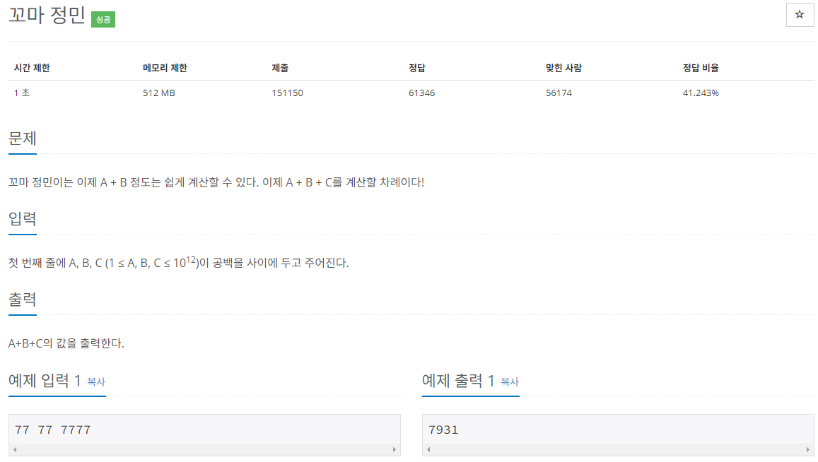 문제를 보자마자 세 수를 더하고 이를 출력하는 간단한 코드라고 생각했습니다.