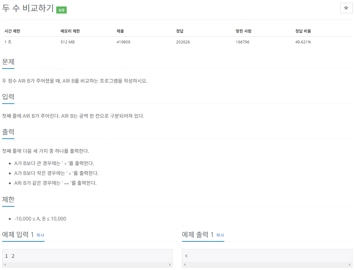 두 정수 A와 B가 주어졌을 때, A와 B를 비교하는 프로그램을 작성하시오.
