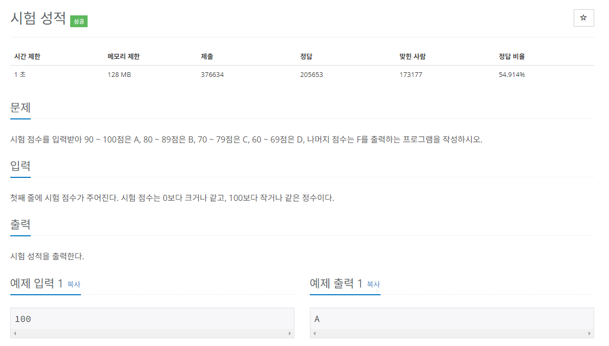 특정 조건에 따라 정해진 출력을 하는 프로그램입니다. 사용해야 할 구문은 switch나 if 문을 떠올릴 수 있으나 점수의 특정값이 아니라 범위가 주어졌기 때문에 switch 보다는 if 구문이 다루기 쉬울 겁니다.