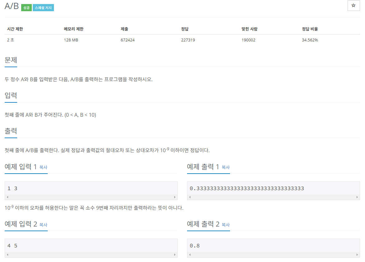 두 정수를 A, B로 입력받고 A/B값을 출력합니다.